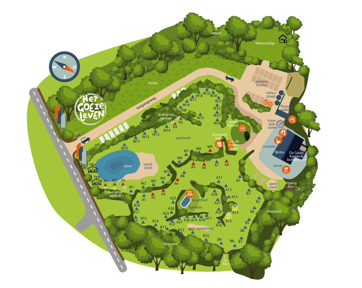 We hebben 70 plekken, waaronder 5 met privé sanitair: een eigen douche en toilet, exclusief voor jou. Nieuw zijn onze 2 kampeerplekken met privé huis(kamer)kas, een knusse overdekte huiskamer midden in het groen. Ook hebben we een aantal verharde kampeerplekjes, deze zijn aangeduid met een rood driehoekje.
